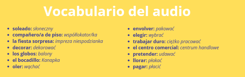 Przed odtworzeniem nagrania upewnij się, że znasz wyodrębnione słownictwo, aby ułatwić zrozumienie podczas słuchania “MI FIESTA SORPRESA“. Następnie przesłuchaj nagranie tyle razy, ile to konieczne i odpowiedz na zadane pytania. Celem jest ocena i poprawa umiejętności rozumienia ze słuchu.